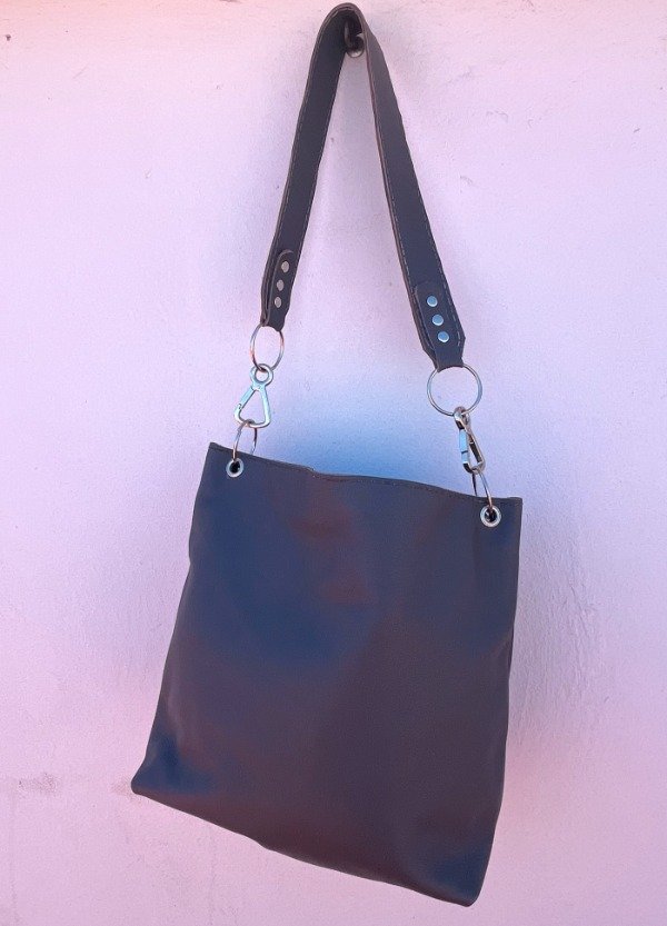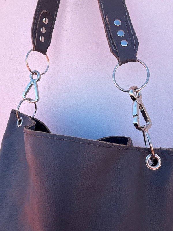 -Cartera tote bag forrada en el interior con tela. Correa intercambiable de soga, con mosquetones.